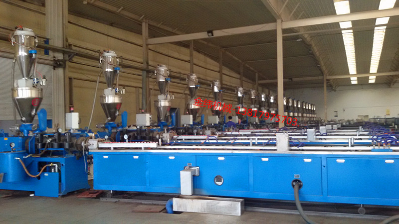目前兩步法應用較為廣泛,一般是用錐雙擠出機或平雙擠出機造粒,再用錐雙或單螺桿擠出機擠出成型制品,主要使用在室內外地板、護欄、托盤等PE一類木塑產品的擠出成型。主要優點是:操作簡單,對生產員工整體技術水平要求較低,對配套模具和擠出成型設備要求相對比一步法要低。