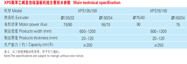 XPS 設備有單螺桿串聯擠出機和同向平雙串聯單螺桿擠出機兩種,規格有:Φ135/Φ150 單螺桿擠出機串聯式和Φ75/Φ150 同向平雙串聯單螺桿擠出機。同向雙螺桿擠出機由于混料效率卓越,能加工由眾多成分構成的配料。